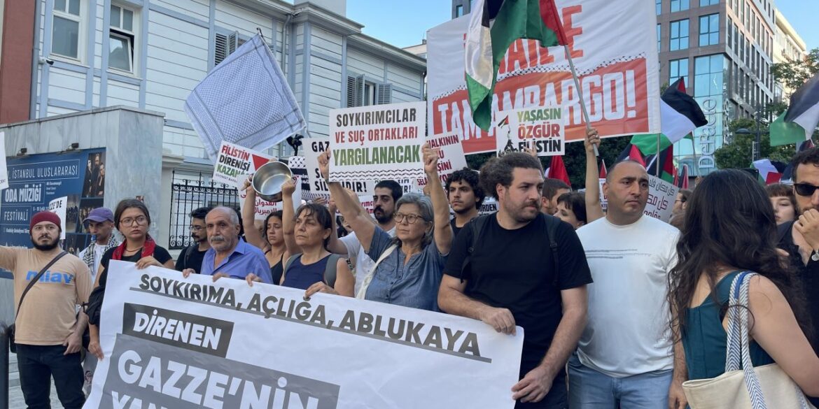 Citizens gathered in front of the Süreyya Opera House in Kadıköy with the call of the Palestine Action Committee to protest Israel’s attacks on Gaza. The activists marched from Süreyya Opera House to Church Square with the slogans “Free Palestine from the river to the sea”, “Don’t watch the genocide, impose a full embargo”. In the press statement, attention was drawn to the hunger crisis in Gaza and a call was made to isolate Israel and impose a full embargo. One person was detained at the end of the action.