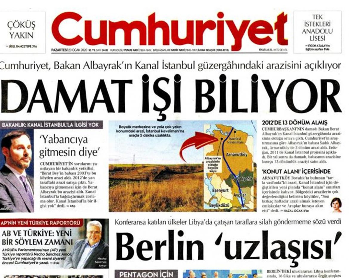 Istanbul Anatolian 7th Criminal Judicature of Peace banned access to the news on Minister of Finance and Treasury Berak Albayrak buying a land at the Canal Istanbul route, which was initially published in Cumhuriyet Daily’s January 20th issue, as well as to all other websites who made related news.