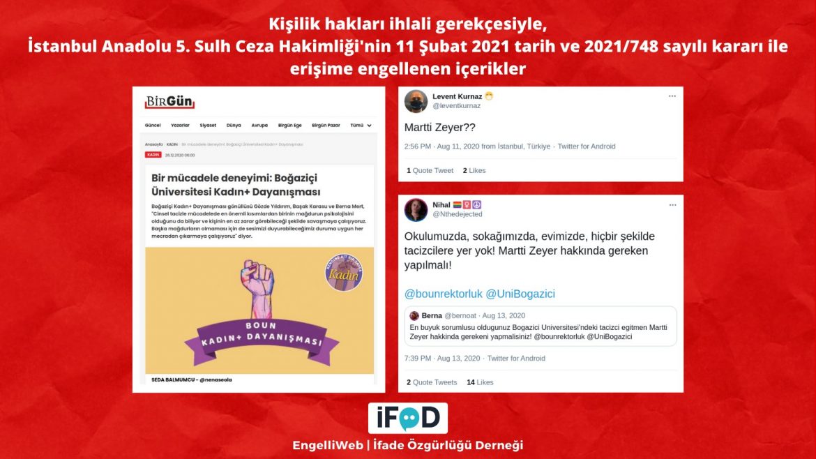 Istanbul Anatolian 5th Criminal Judicature of Peace issued an access ban against the news published on Birgün Daily regarding the Women+ Solidarity at Boğaziçi University as well as the related social media posts. Elazığ Keban Criminal Judicature of Peace issued an access ban against the news on the complaint made at the Presidency against a citizen, who said, “I am the government, I am a man of the Islamic-Ottoman complex.”