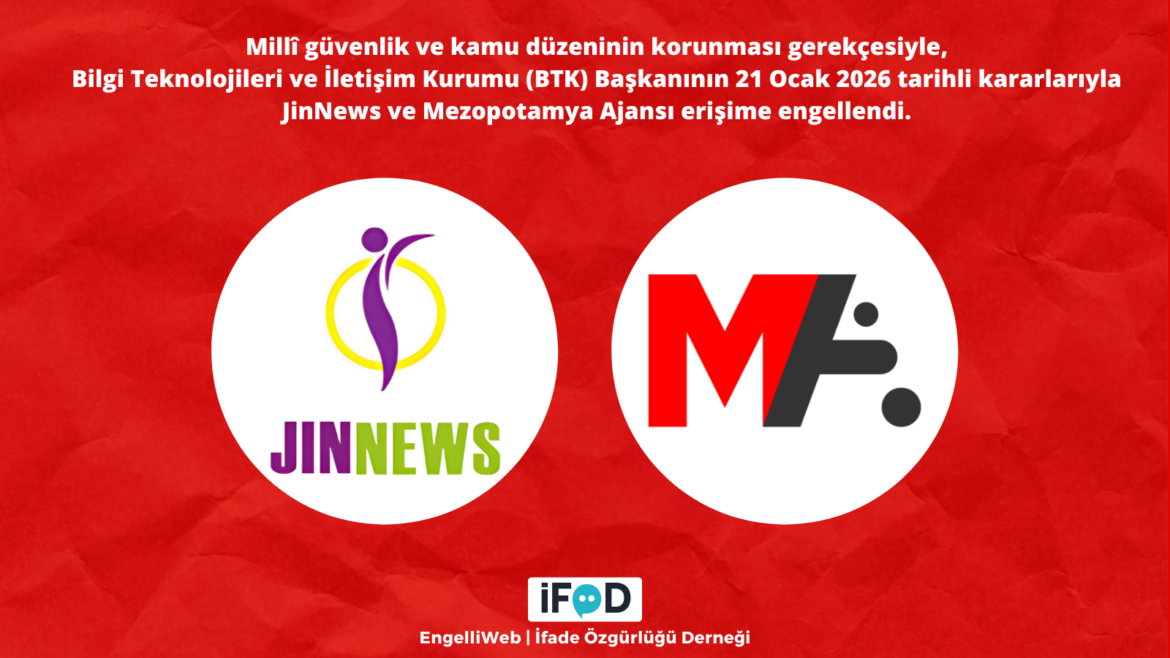 Access to JinNews and Mezopotamya Agency has been blocked by decisions made by the President of the Information and Communication Technologies Authority (BTK). JinNews’ domain name jinnews.net was blocked by decision no. 490.05.01.2026.-66262, while Mezopotamya Agency’s domain name mezopotamyaajansi43.com was blocked by decision no. 490.05.01.2026.-66263. The decisions were made on the grounds of “protecting national security and public order.” The access ban was approved by the Ankara 10th Criminal Court of Peace on January 21, 2026.