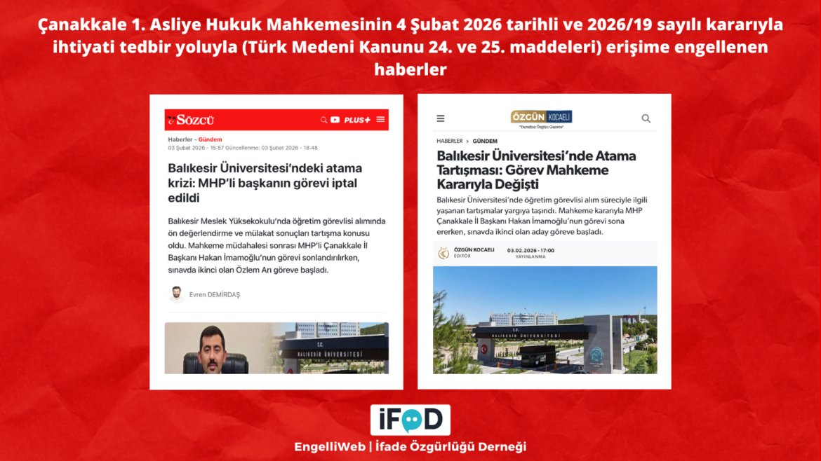 Despite ranking ninth in the recruitment process for teaching positions at Balıkesir University, access to news reports regarding the dismissal of MHP Çanakkale Provincial Chairman Hakan İmamoğlu, who had started work after the interview, has been blocked by court order. The Çanakkale 1st Civil Court of First Instance ruled on February 4, 2026, with decision number 2026/19, to apply an access restriction as a precautionary measure in accordance with Articles 24 and 25 of the Turkish Civil Code. It was reported that the decision covered news reports about İmamoğlu’s dismissal from his position by court order.