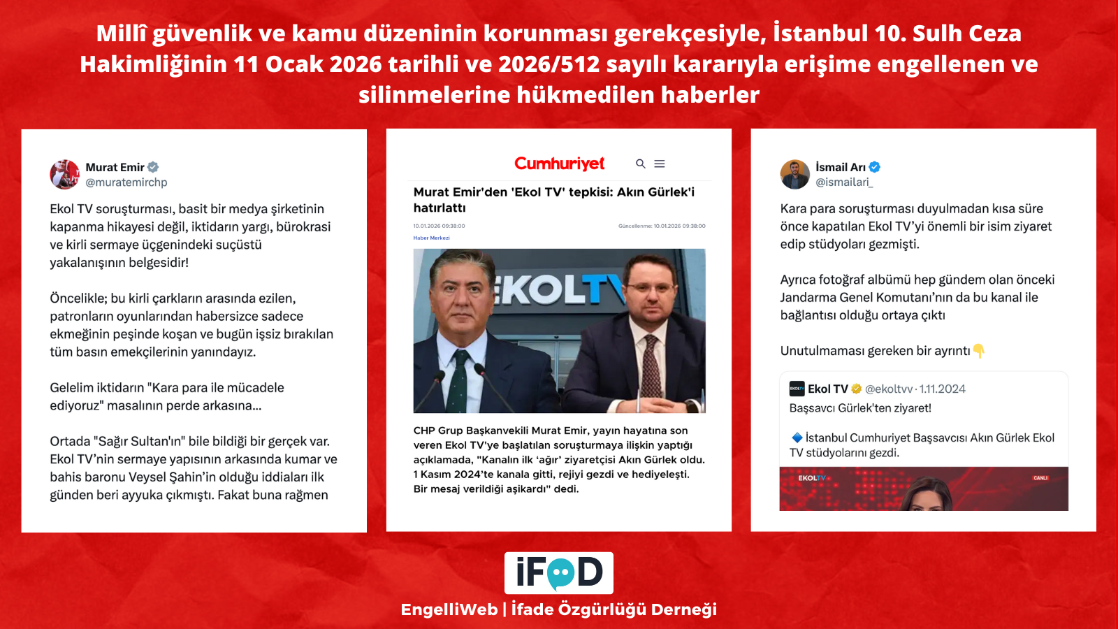 Following CHP Deputy Group Leader Murat Emir’s mention of Istanbul Chief Prosecutor Akın Gürlek’s visit to Ekol TV as part of an investigation into the channel, news reports and social media posts related to the matter were blocked on January 11. The Istanbul 10th Criminal Court of Peace based its decision, numbered 2026/512, on the grounds of protecting national security and public order. While the X platform did not make Murat Emir’s post invisible in Turkey, it did make journalist İsmail Arı’s post invisible in Turkey.
