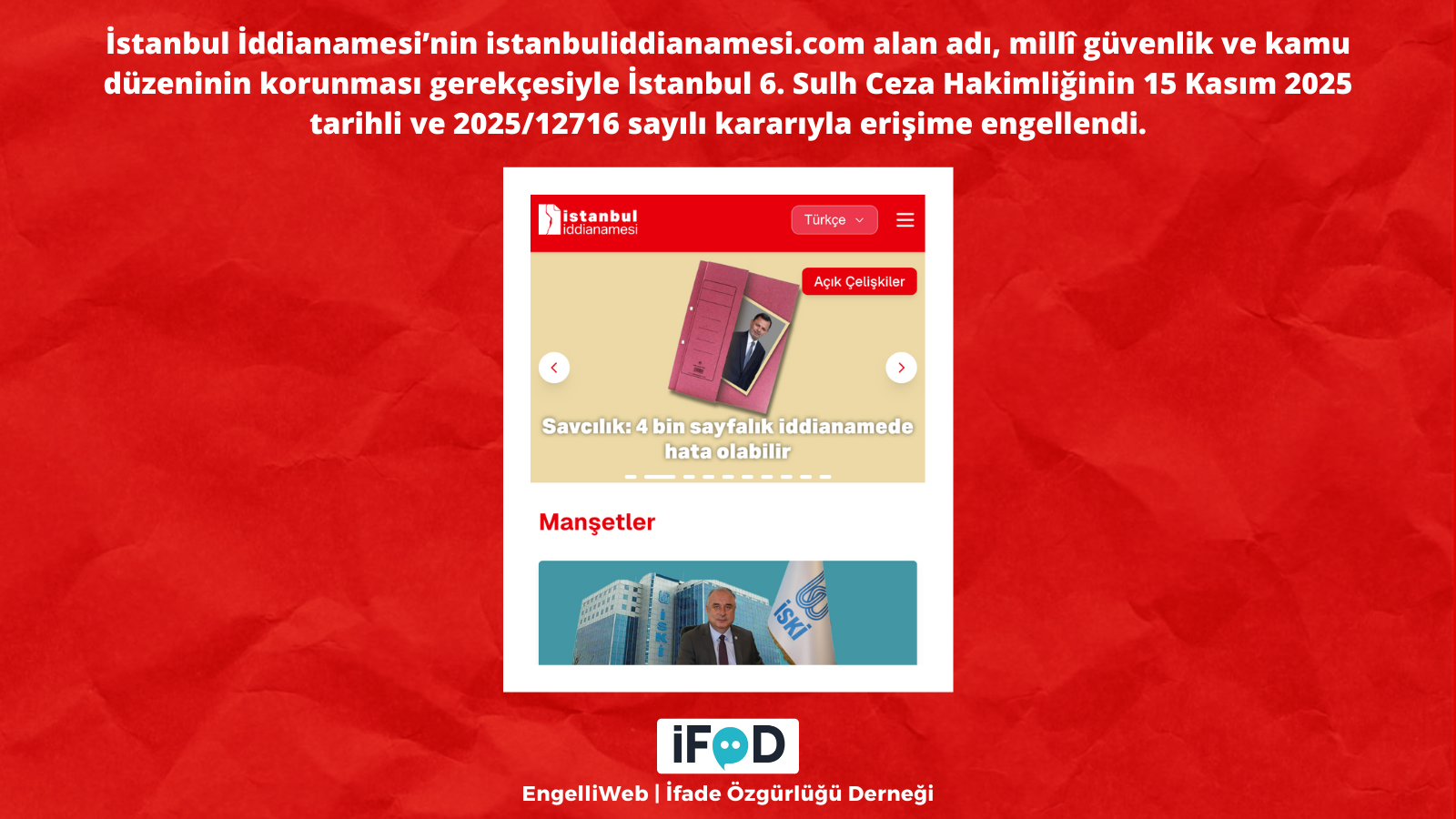 Following the indictment prepared by the Istanbul Chief Public Prosecutor’s Office regarding allegations of “corruption” at the Istanbul Metropolitan Municipality (İBB), the website and X account that published the contents of the “Istanbul Indictment” had previously been made invisible from Turkey. The Istanbul 6th Criminal Court of Peace, in its decision dated November 15, 2025, numbered 2025/12716, blocked access to the domain name istanbuliddianamesi.com and the website (istanbuliddianamesi.com/tr) on the grounds of national security and public order, citing Article 8/A of Law No. 5651.