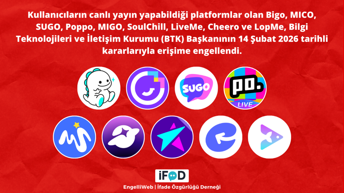 The President of the Information and Communications Technology Authority imposed an access ban on the live streaming platforms Bigo, MICO, SUGO, Poppo, MIGO, SoulChill, LiveMe, Cheero, and LopMe on February 14, 2026. BTK made the decision through administrative proceedings. Previously, on October 14, 2024, the Ankara 4th Criminal Court of Peace had blocked access to Bigo Live; in August 2025, access to many video chat and dating platforms was also blocked.