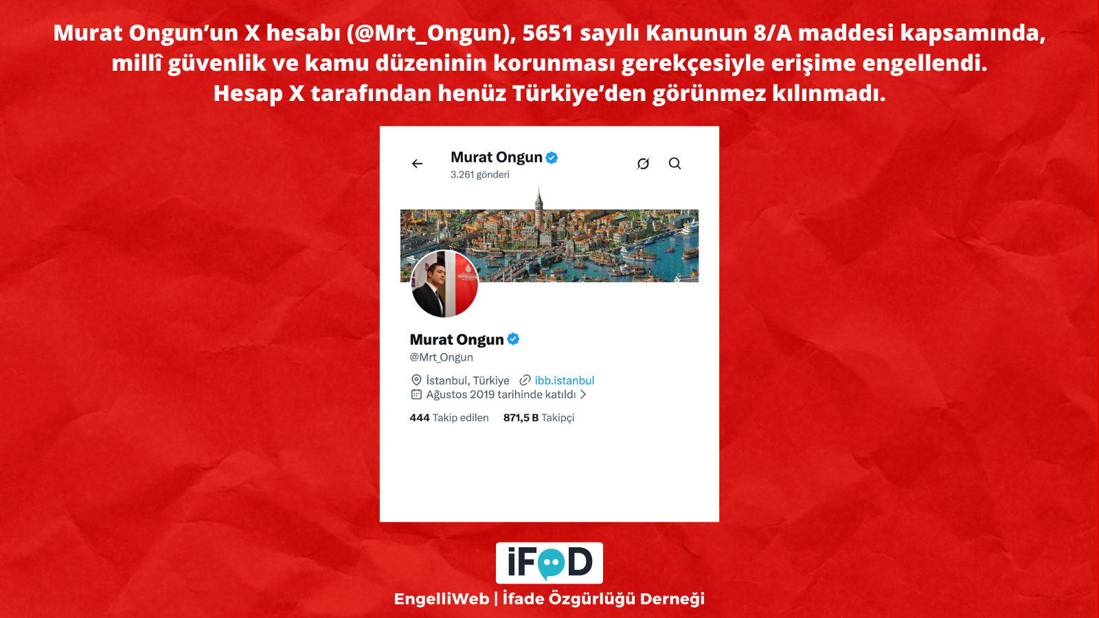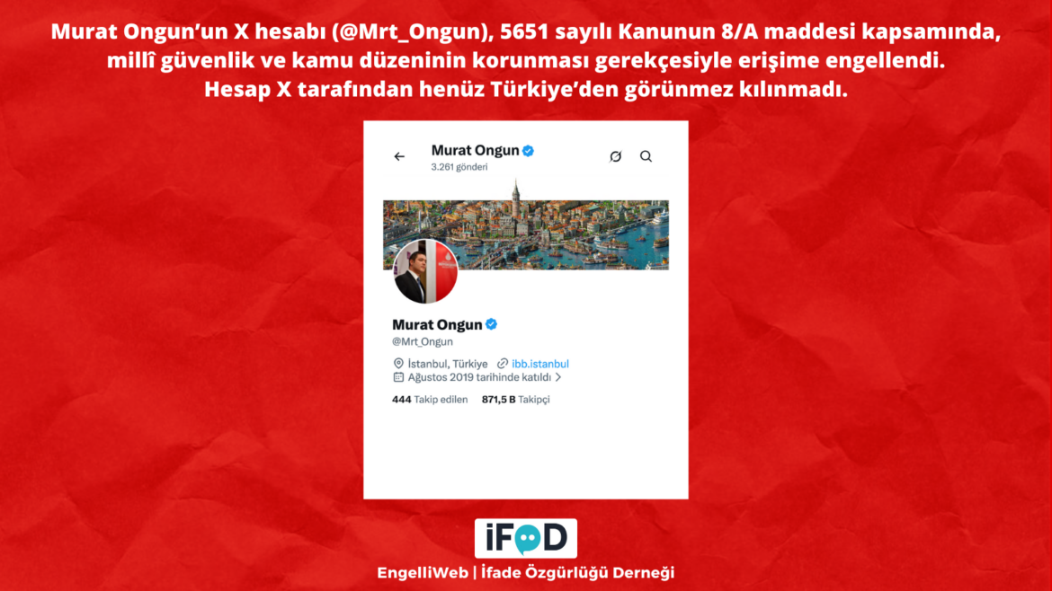 Access to the X account (@Mrt_Ongun) of Murat Ongun, former Chairman of the Board of Directors of Medya A.Ş., who is currently detained as part of an investigation by the Istanbul Metropolitan Municipality, was blocked on January 2. The blocking decision was made under Article 8/A of Law No. 5651 on the grounds of protecting national security and public order. The Freedom of Expression Association announced that the account has not yet been made invisible in Turkey by the X platform.