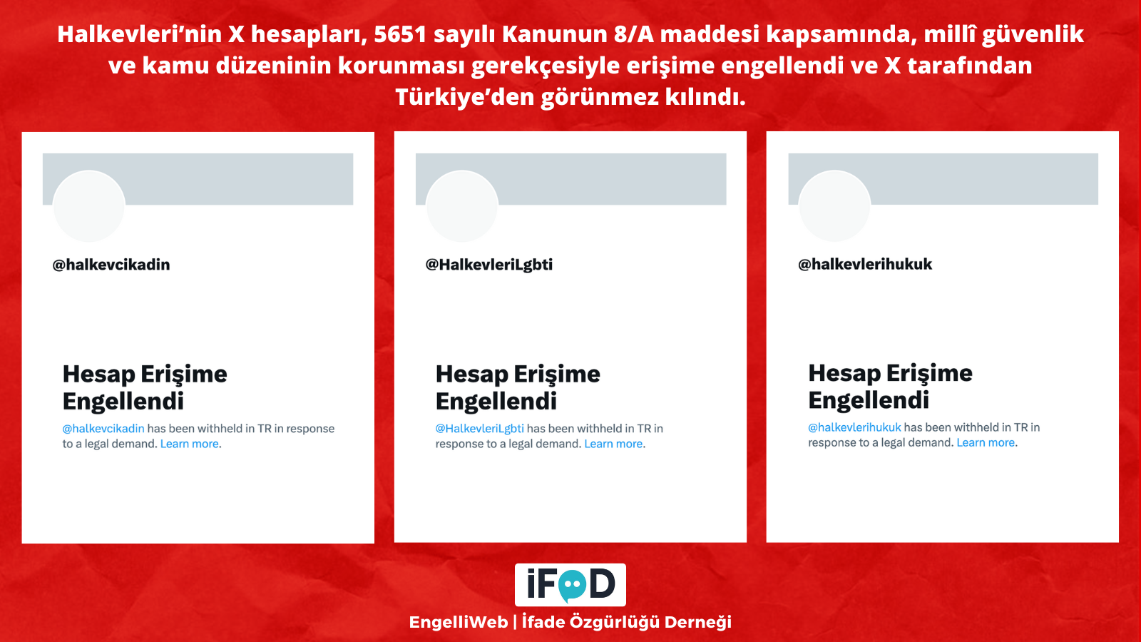The X social media accounts belonging to Halkevleri were blocked on January 7 under Article 8/A of Law No. 5651 on the grounds of protecting national security and public order. Following the blocking decision, the Freedom of Expression Association announced that the accounts had been made invisible in Turkey by the X platform. The list of blocked accounts was shared with the public.