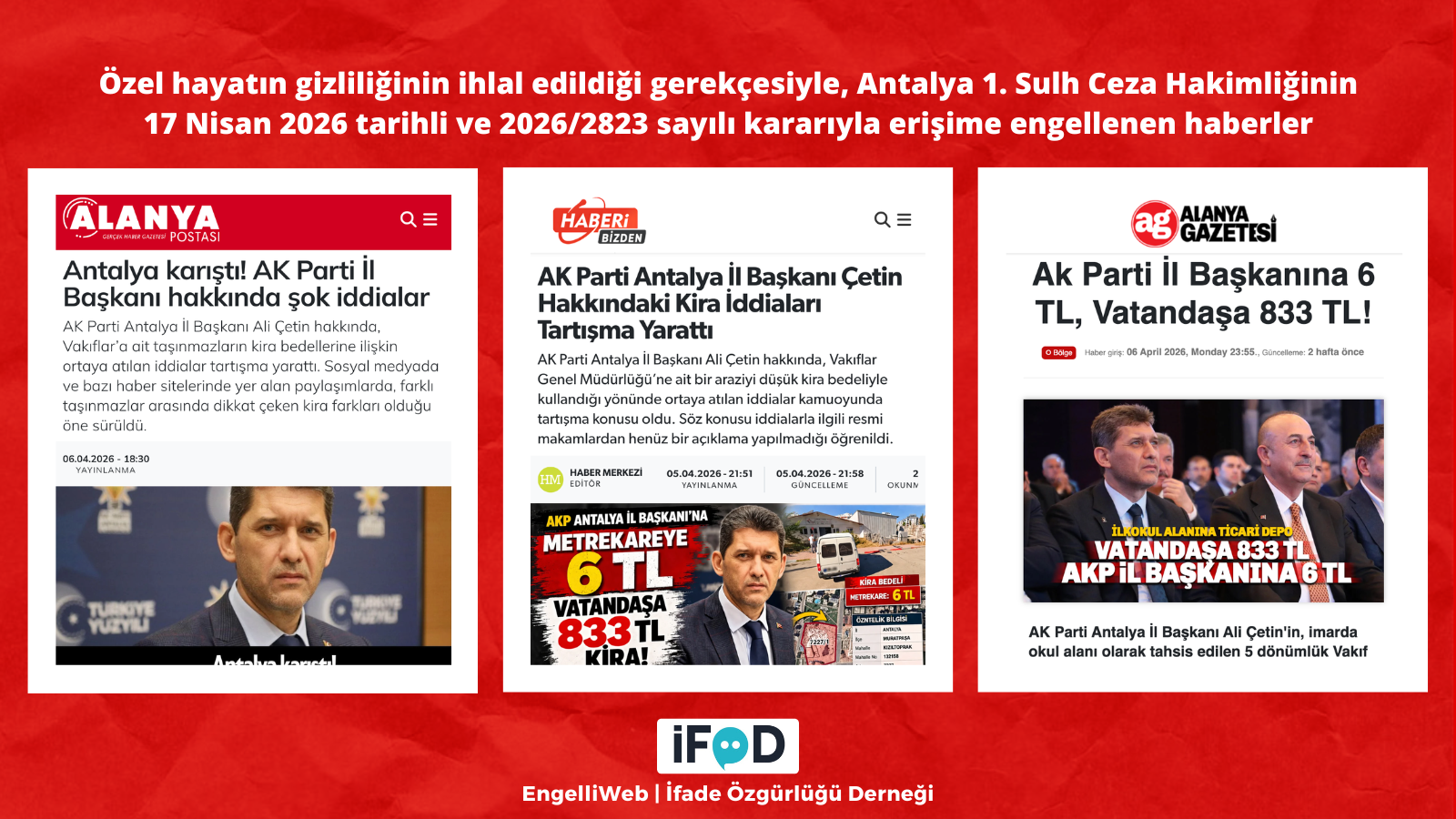 News reports containing allegations regarding the use of a public property by Ali Çetin, the AKP Provincial Chairman of Antalya, were blocked from access on April 17, 2026, by a decision of the Antalya 1st Criminal Court of Peace. It was stated that the decision was issued on the grounds of a violation of privacy.