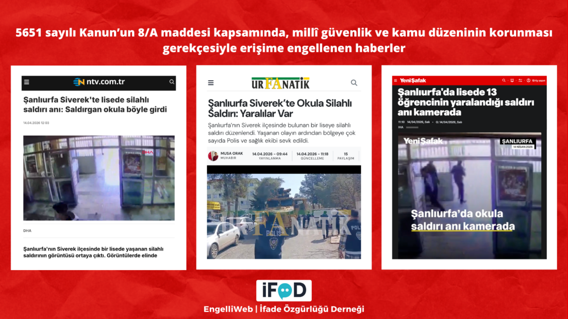 News reports regarding an armed attack at a high school in the Siverek district of Şanlıurfa, in which 16 people were injured, were blocked on April 14, 2026, under Article 8/A of Law No. 5651. It was stated that the decision was made on grounds of national security and public order.