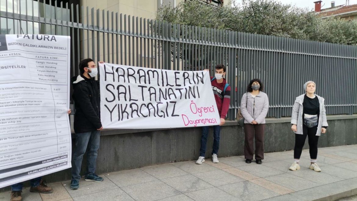 Student Solidarity members made a statement in front of Cengiz Holding, Kolin Group and Turkish Industry and Business Association (TÜSİAD) on January 9, with a banner reading “We Will Overthrow the Reign of Thieves” to protest the worsening economic conditions with the new year. The members were summoned to testify after Mehmet Cengiz’s application with the allegation of “threat and insult”.