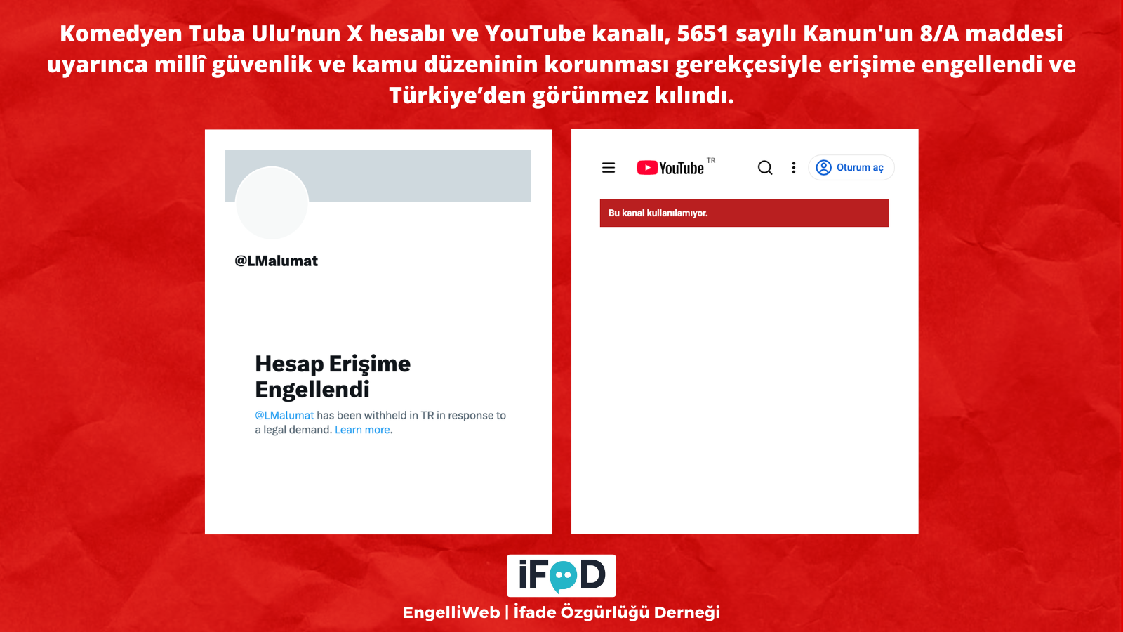 Comedian Tuba Ulu, who faced an investigation over a joke made during a stand-up show, had her X account and YouTube channel blocked on April 10, 2026. It was stated that the decision was made under Article 8/A of Law No. 5651 on the grounds of “national security and public order.”