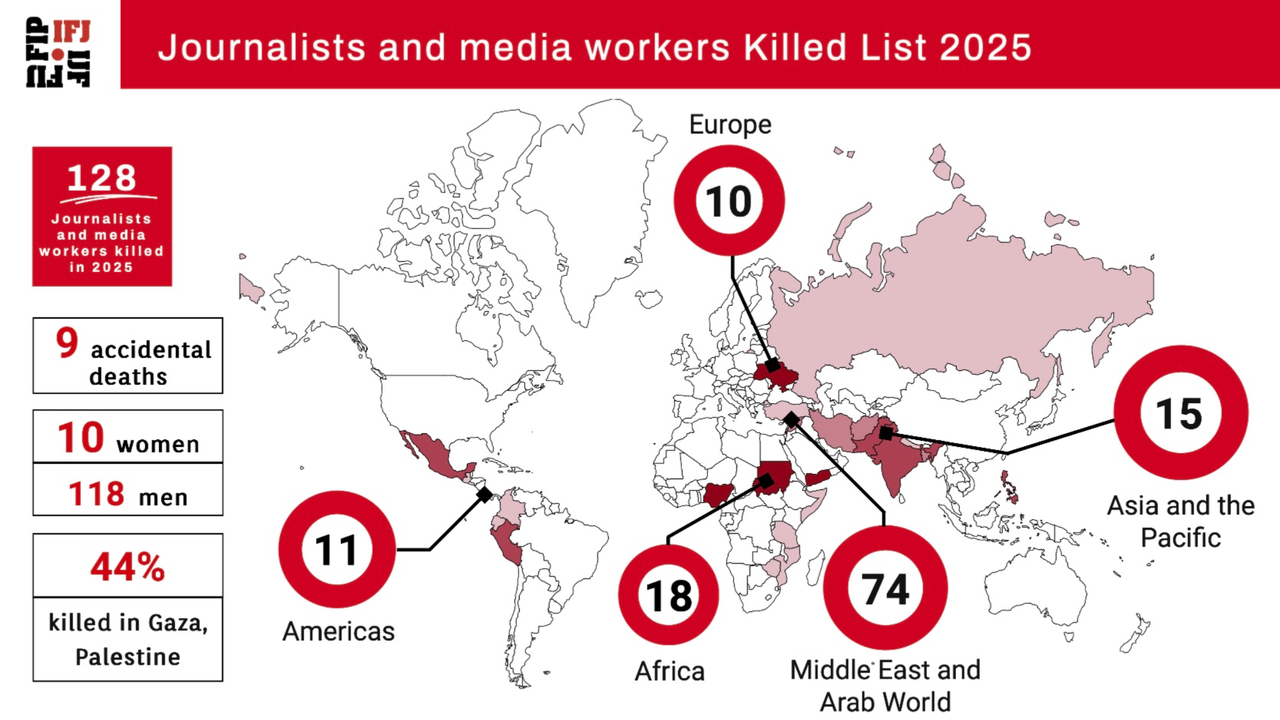 The International Federation of Journalists (IFJ) published its final “List of Journalists Killed” for 2025 on December 31. According to IFJ data, a total of 128 journalists and media workers lost their lives in 2025, 10 of whom were women; nine of the deaths were accidental. The Federation stated that authorities have systematically failed to protect journalists and called for urgent steps to break the cycle of impunity. According to the report, the Middle East and Arab World was the deadliest region for the third consecutive year with 74 deaths; 56 journalists were killed in Palestine. The IFJ announced that 3,173 journalists and media workers have been killed worldwide since 1990, and that 533 journalists were in prison as of 2025.