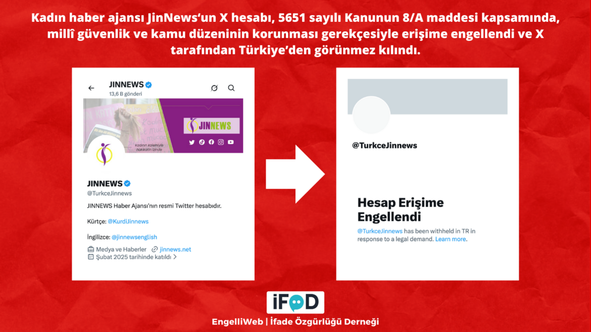 The Turkish X account @TurkceJinnews of the women’s news agency JinNews was blocked on January 8 on the grounds of protecting national security and public order. The Freedom of Expression Association announced that the account had been made invisible in Turkey by X.