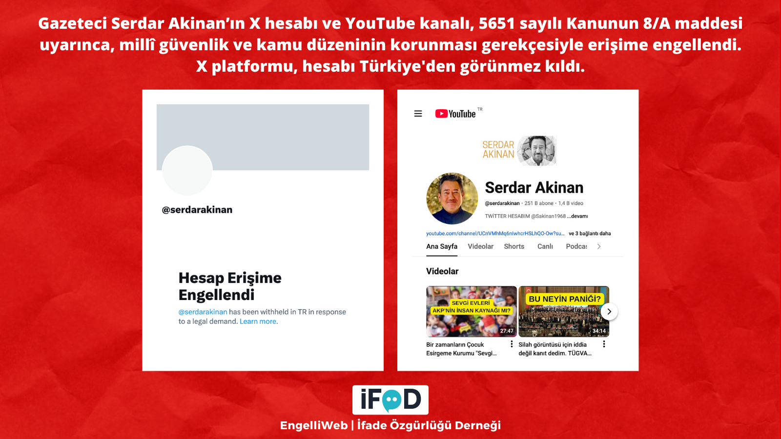 The Freedom of Expression Association announced that journalist Serdar Akinan’s X account and YouTube channel had been blocked. The decision under which the access restriction was imposed was not disclosed. The association informed the public that the decision violated freedom of expression.