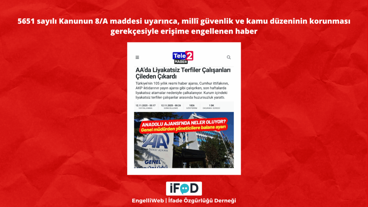 The news report regarding allegations of unqualified appointments at Anadolu Agency was blocked from access pursuant to Article 8/A of Law No. 5651, on the grounds of protecting national security and public order.