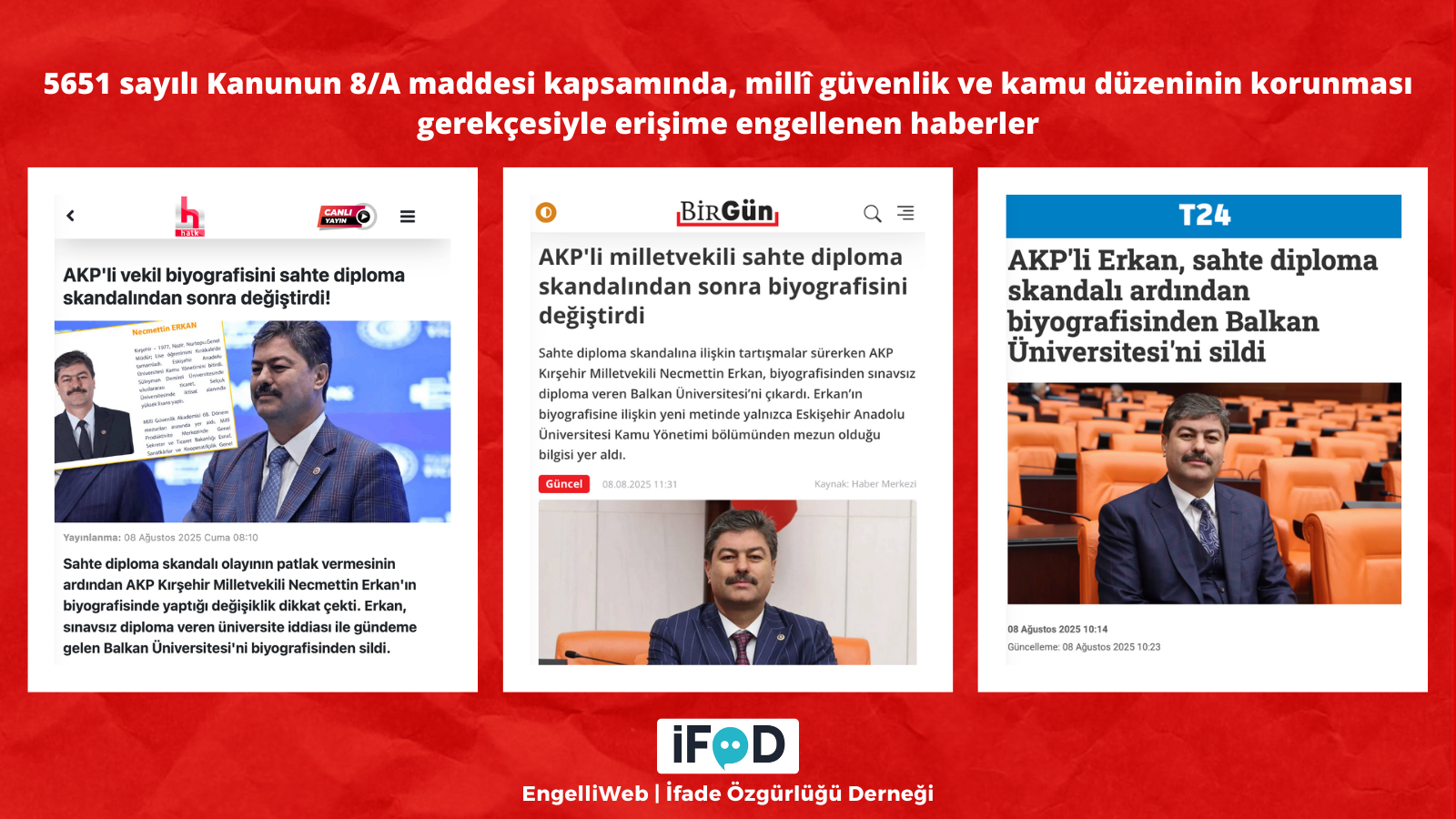 AKP Kırşehir Milletvekili Necmettin Erkan’ın biyografisinden sınavsız diploma veren Balkan Üniversitesi bilgisini çıkarmasına ilişkin haberler, 5651 sayılı Kanun’un 8/A maddesi kapsamında “millî güvenlik ve kamu düzeninin korunması” gerekçesiyle erişime engellendi.