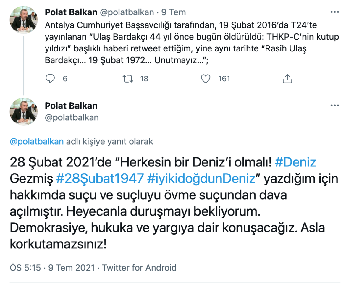Antalya Barosu Başkanı Polat Balkan hakkında iki sosyal medya paylaşımı gerekçe gösterilerek, Antalya Cumhuriyet Başsavcılığı tarafından “suçu ve suçluyu övmek” suçlamasıyla soruşturma başlatıldı. Balkan’ın, 19 Şubat 2016’da T24’te yayınlanan “Ulaş Bardakçı 44 yıl önce bugün öldürüldü: THKP-C’nin kutup yıldızı” başlıklı haberi retweet etmesi ve 28 Şubat 2021’de “Herkesin bir Deniz’i olmalı! #Deniz Gezmiş #28Şubat1947 #iyikidoğdunDeniz” sözleri soruşturmaya gerekçe edildi.