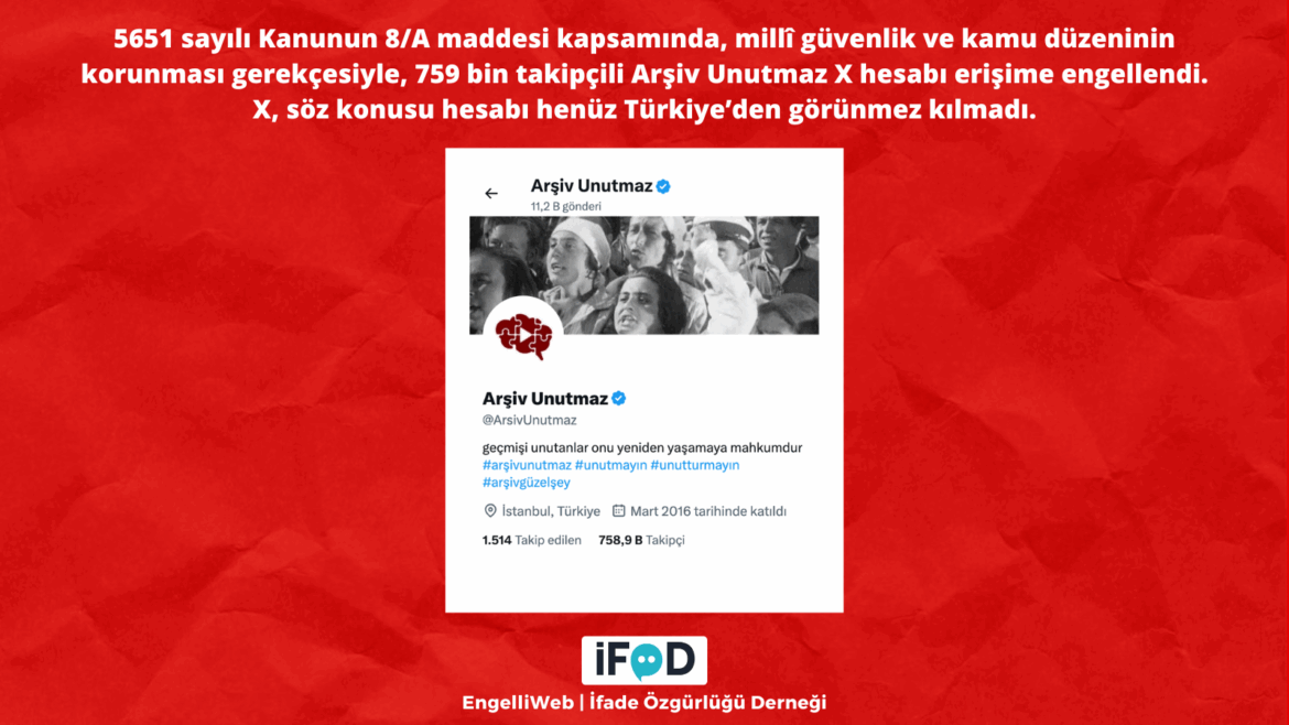 Geçmişteki açıklamaları hatırlatarak Türkiye’nin siyasi hafızasını canlı tutan Arşiv Unutmaz isimli X hesabına erişim engeli getirildi ve karar internet servis sağlayıcılarına iletildi. Hangi hakimliğin kararı verdiği bilinmezken, X platformu 759 bin takipçili hesabı henüz Türkiye’den görünmez kılmadı.