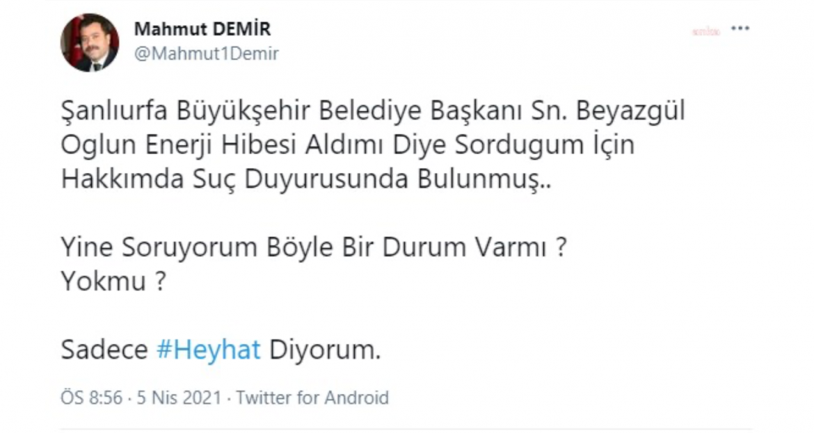 Gelecek Partisi Eyyubiye İlçe Başkanı Mahmut Demir, Şanlıurfa Belediye Başkanı Zeynel Abidin Beyazgül’ün oğlunun devletten toplamda 10 milyon dolarlık enerji hibesi alıp almadığını sorduğu Twitter paylaşımı sonrasında emniyette ifade verdi.