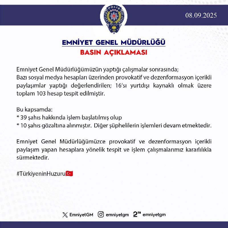 Emniyet Genel Müdürlüğü, 16’sı yurtdışı kaynaklı olmak üzere 103 sosyal medya hesabını incelediğini açıkladı. Bu hesaplar üzerinden “provokatif ve dezenformasyon içerikli” paylaşımlar yapıldığı iddia edildi.
