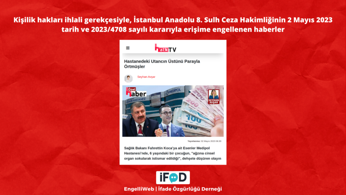 Gazeteci Seyhan Avşar’ın, Sağlık Bakanı Fahrettin Koca’ya ait olduğu bilinen Esenler Medipol Hastanesi’nde bir çocuğun istismar edildiği ve olayın aileye ‘manevi tazminat’ adı altında 150 bin TL’lik bir sözleşme imzalatılarak kapatıldığı iddiasını gündeme taşıdığı haberi İstanbul Anadolu 8. Sulh Ceza Hakimliği kararıyla erişime engellendi.