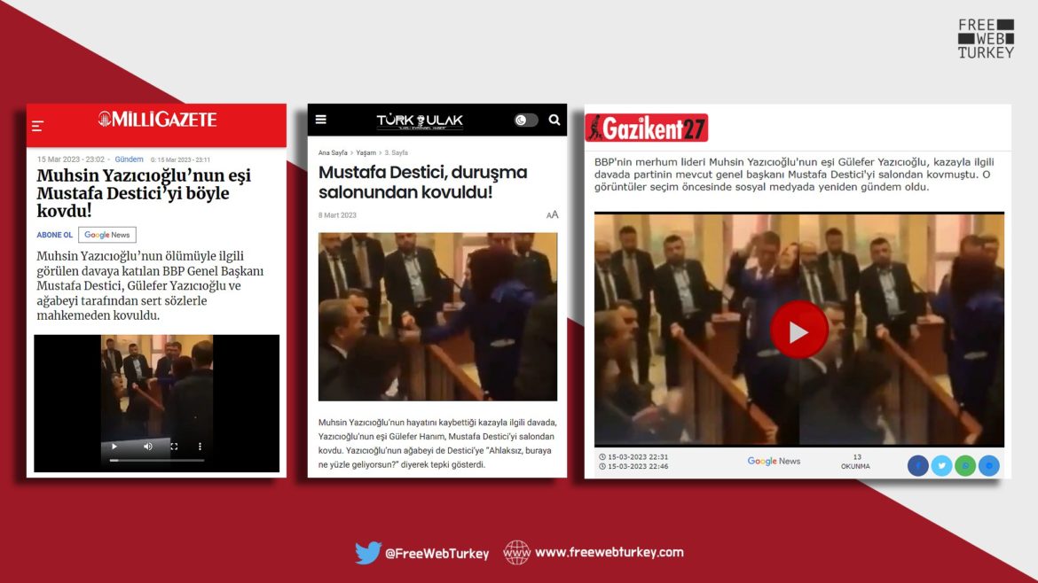 2009 yılında şüpheli bir helikopter kazasında yaşamını yitiren Büyük Birlik Partisi Genel Başkanı Muhsin Yazıcoğlu’nun ölümüne ilişkin devam eden davada eşi Gülefer Yazıcıoğlu’nun BBP Genel Başkanı Mustafa Destici’yi salondan kovmasına ilişkin 134 haber ve sosyal medya paylaşımı, Ankara 2. Sulh Ceza Hakimliğinin kararıyla erişime engellendi.