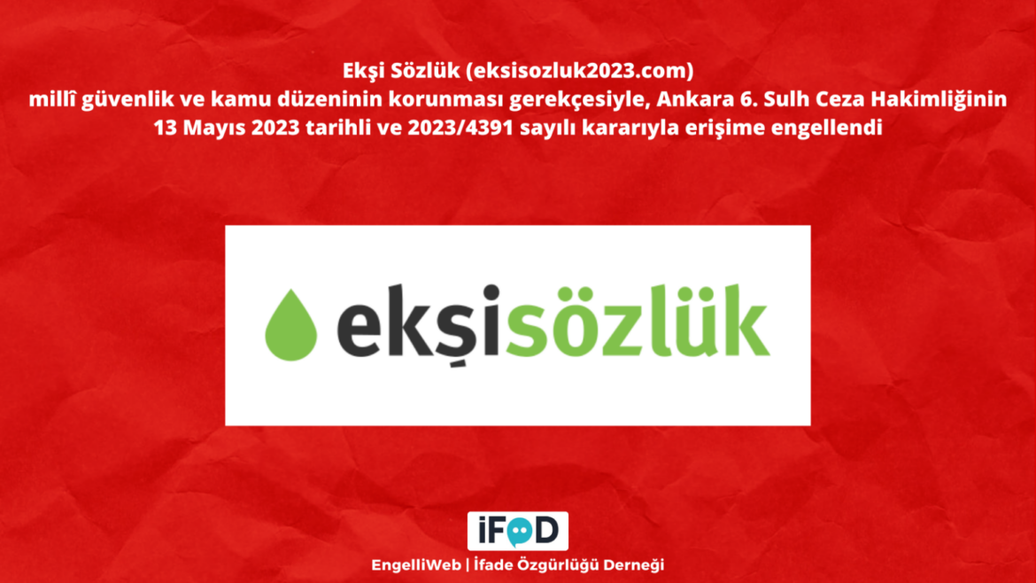 “Milli güvenlik ve kamu düzeninin korunması” gerekçesiyle Şubat ayında sansürlenen  Türkiye’nin en yaygın çevrimiçi interaktif sosyal iletişim mecralarından Ekşi Sözlük’ün yeni kullandığı alan adı (eksisozluk2023.com) da aynı gerekçe ile  Ankara 6.  Sulh Ceza Hakimliği tarafından seçime bir gün kala erişime engellendi.
