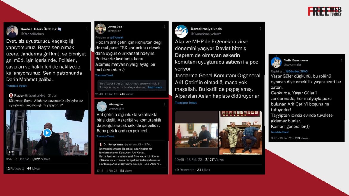 Ankara 1. Sulh Ceza Hakimliği, Jandarma Genel Komutanı Orgeneral Arif Çetin’in talebi üzerine dokuz tweet ve bir YouTube videosuna erişim engeli getirdi.