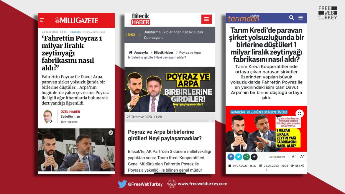 Hakkındaki yolsuzluk haberlerini önlemeye çalıştığı için ‘gazetecinin haber yapmasını maksatlı ve organize bir şekilde engellemek’ten tazminata mahkum edilen Tarım Kredi Koop. Eski Genel Müdürü Fahrettin Poyraz hakkındaki üç haber, Gölbaşı Sulh Ceza Hakimliği kararıyla erişime engellendi.