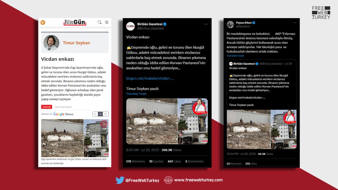Kahramanmaraş’ta 6 Şubat’taki depremde bulunduğu sitede yıkılan tek bina olan ve binanın altındaki Kervan Pastanesi tarafından yapılan genişletme çalışmaları nedeniyle yıkıldığı iddia edilen Ezgi Apartmanıyla ilgili, BirGün gazetesi yazarı Timur Soykan’ın, pastanenin bağlı bulunduğu Kervan Lezzetler Grubu’nun Yönetim Kurulu Başkanı Sami Kervancıoğlu ile hükümet yetkilileri arasındaki ilişkileri ortaya koyan “Vicdan Enkazı” başlıklı yazısı Kahramanmaraş 1. Sulh Ceza Hakimliği kararıyla erişime engellendi. Kervancıoğlu, daha önce de Cumhuriyet gazetesinde yayımlanan “Ezgi Apartmanı’nda müvekkili ölen avukattan çağrı: Dosyaya gizlilik kararı gelmemeli” başlıklı haberin sansürlenmesini istemiş ancak Kahramanmaraş 2. Sulh Ceza Hakimliği “olayın meydana getirdiği hususlar da göz önünde bulundurulmalı” diyerek talebi reddetmişti.