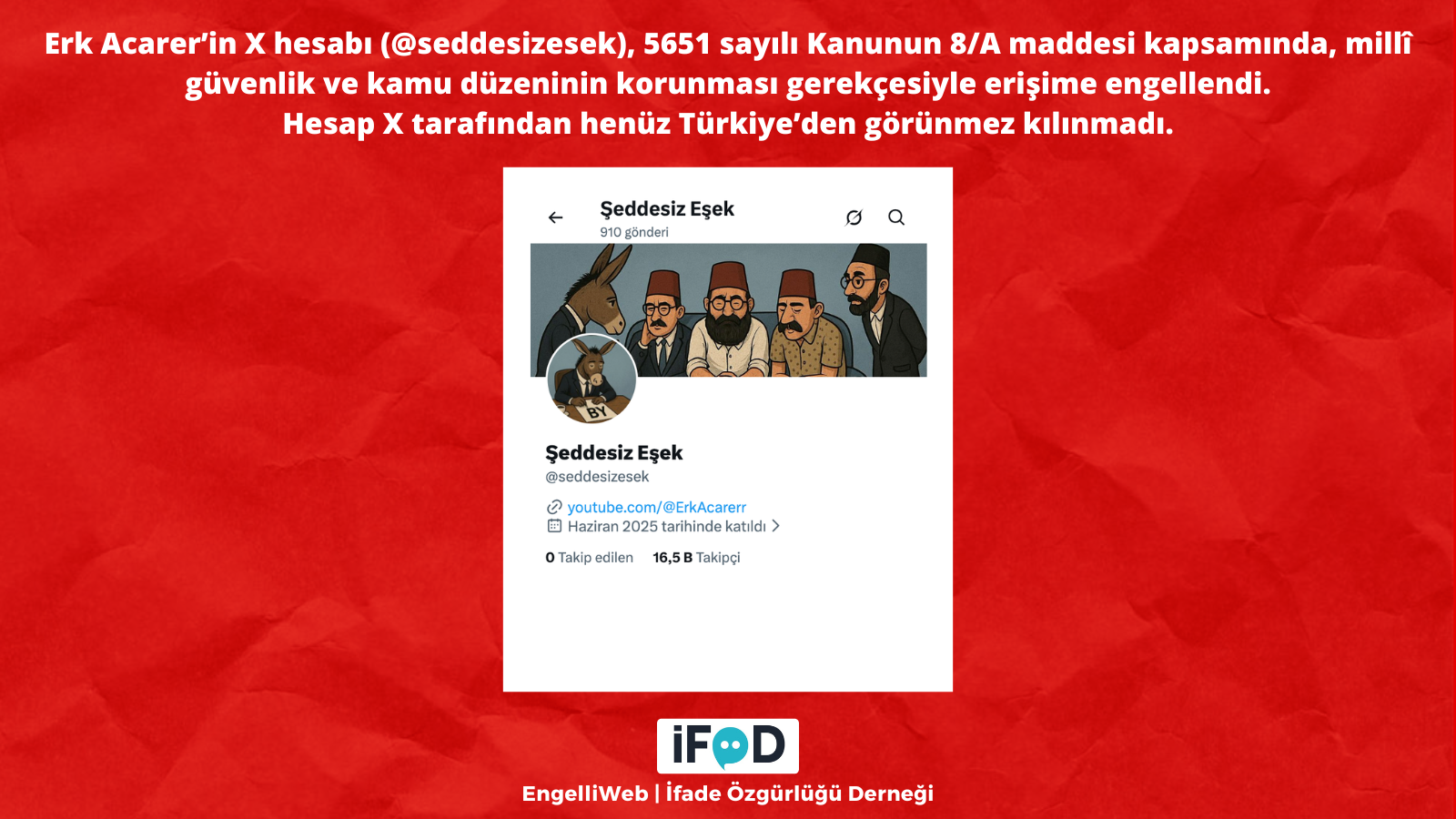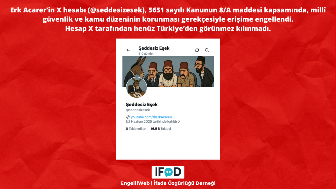 Gazeteci Erk Acarer’in X hesabı (@seddesizesek), 15 Nisan 2026’da 5651 sayılı Kanun’un 8/A maddesi kapsamında millî güvenlik ve kamu düzeni gerekçesiyle erişime engellendi. Hesabın X platformu tarafından Türkiye’den henüz görünmez kılınmadığı belirtildi.