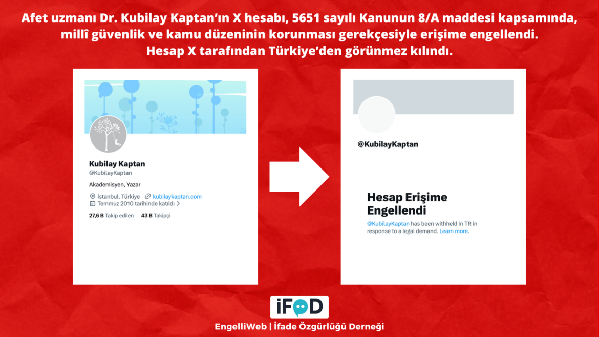 Afet uzmanı Dr. Kubilay Kaptan’ın X hesabı, 5651 sayılı Kanunun 8/A maddesi kapsamında, millî güvenlik ve kamu düzeninin korunması gerekçesiyle erişime engellendi. Hesap X tarafından Türkiye’den görünmez kılındı.