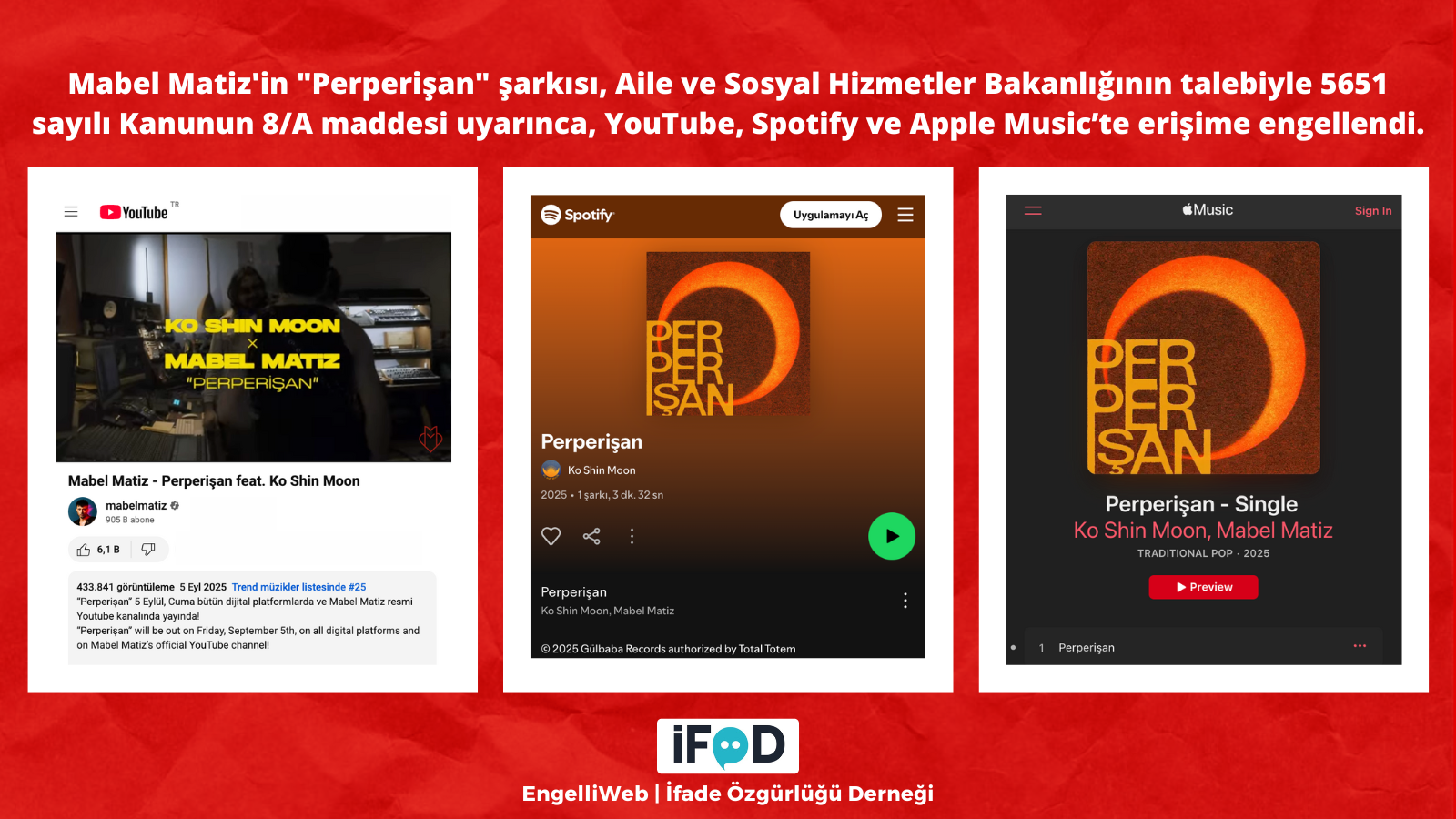 Aile ve Sosyal Hizmetler Bakanlığının talebiyle Mabel Matiz’in “Perperişan” şarkısı 5651 sayılı Kanun’un 8/A maddesi uyarınca YouTube, Spotify ve Apple Music’te erişime engellendi. Şarkı platformlardan henüz tamamen kaldırılmadı.