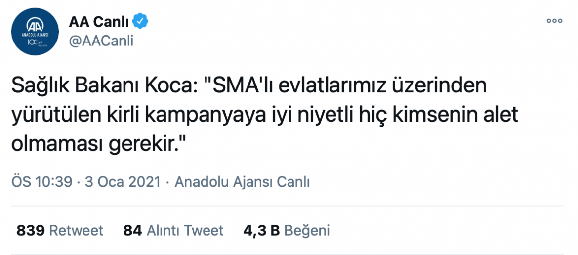 Sosyal medyada gündem olan ve Milli Piyango yılbaşı çekilişinde dağıtılmayan 75 milyonun varlık fonuna devri yerine SMA’lı çocukların tedavisine harcanmasını dile getirenler AKP Genel Başkan Yardımcısı Mahir Ünal ve Sağlık Bakanı Fahrettin Koca’nın hedefi oldular. Her iki isim de kampanyaya destek verenleri “kara propagandaya alet olanlar, tek merkezden yönetilenler…” diyerek hedef gösterdi.