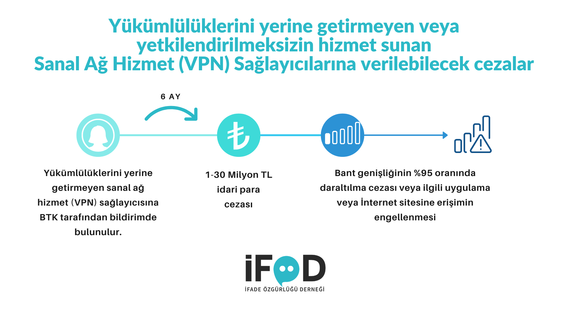 İfade Özgürlüğü Derneği, 20 Nisan’da VPN hizmetlerine yönelik yeni yasal düzenleme planını duyurdu. Teklif, VPN sağlayıcılarının Türkiye’de şirket kurmasını ve BTK’dan yetki almasını zorunlu kıldı. Yetkililer kurallara uymayanlara 1 ila 30 milyon TL arasında para cezası uygulanacağını, yükümlülükleri yerine getirmeyenlere bant daraltma veya erişim engeli getirileceğini açıkladı.