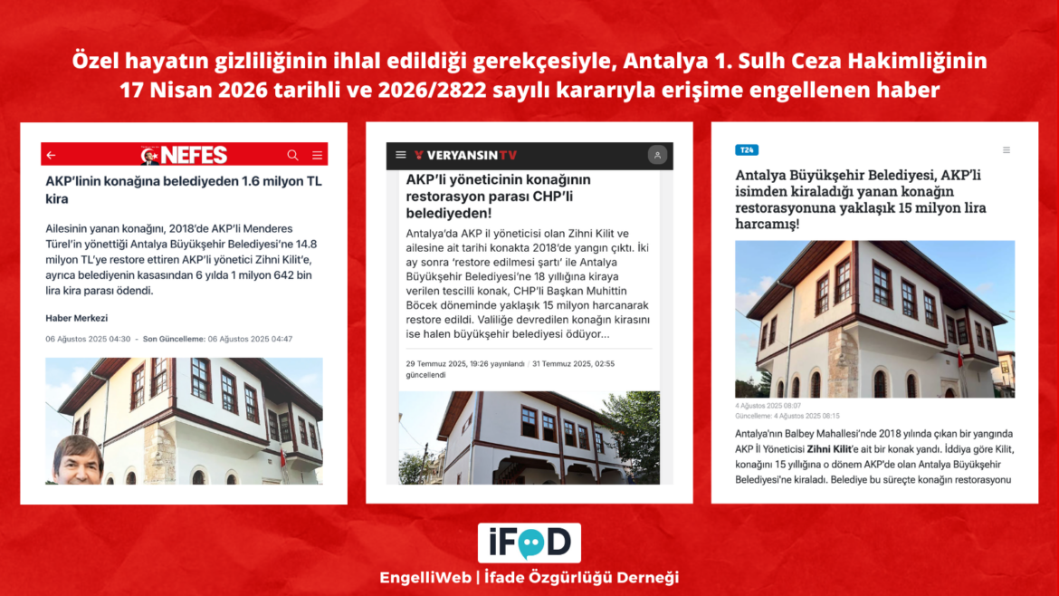 Antalya’da AKP İl Yöneticisi Zihni Kilit ve ailesine ilişkin iddiaları içeren haberler, 17 Nisan 2026’da Antalya 1. Sulh Ceza Hakimliğinin kararıyla erişime engellendi. Kararın özel hayatın gizliliğinin ihlali gerekçesiyle verildiği açıklandı.
