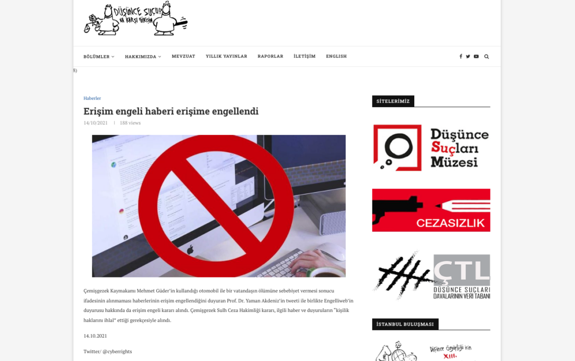 Tunceli Çemişgezek Kaymakamı Mehmet Güder’in kullandığı otomobil ile bir vatandaşın ölümüne sebebiyet vermesiyle ilgili haberlerin erişime engellemesini duyuran online içeriklerin Çemişgezek Sulh Ceza Hakimliği kararıyla sansürlenmesi ile ilgili internet sitemizde yer alan haber de İstanbul 10. Sulh Ceza Hakimliği kararıyla erişime engellendi. Aynı kararla çoğunluğu haber 32 ayrı online içerik de sansürlendi.
